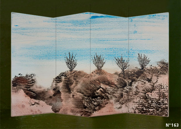 Pliables, transportables, ces petites peintures sont en lien direct avec les peintures de voyage de la renaissance. Peintes « a tempera » sur papier apprêté à la caséine, elles sont l’évocation d’un lieu. Souvenir d’un paysage qui nous parle, nous apaise …