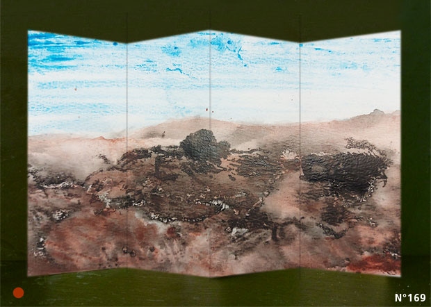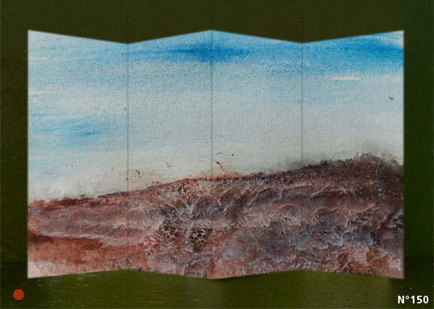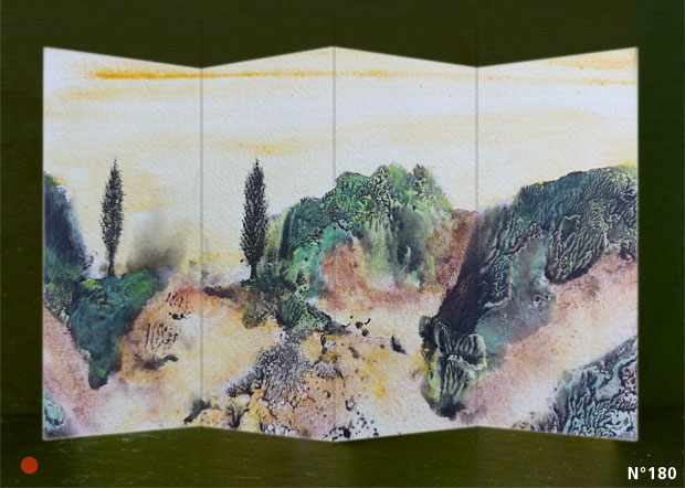 Pliables, transportables, ces petites peintures sont en lien direct avec les peintures de voyage de la renaissance. Peintes « a tempera » sur papier apprêté à la caséine, elles sont l’évocation d’un lieu. Souvenir d’un paysage qui nous parle, nous apaise …